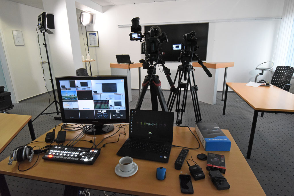 Das war gestern mein Arbeitsplatz von 23:00 bis 01:30 Uhr … Live-Vorführung mit 3 Kameras nach Japan und USA, daher die ungewöhnliche Zeit